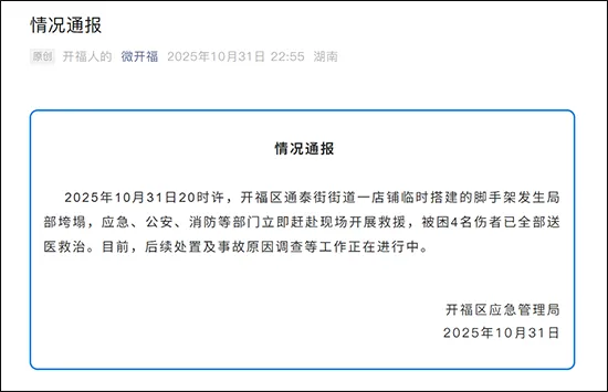 10月31日晚,湖南省长沙市开福区应急管理局通过微信公众号“微开福”发布情况通报称, 2025年10月31日20时许,开福区通泰街街道一店铺临时搭建的脚手架发生局部垮塌,应急、公安、消防等部门立即赶赴现场开展救援,被困4名伤者已全部送医救治。目前,后续处置及事故原因调查等工作正在进行中。